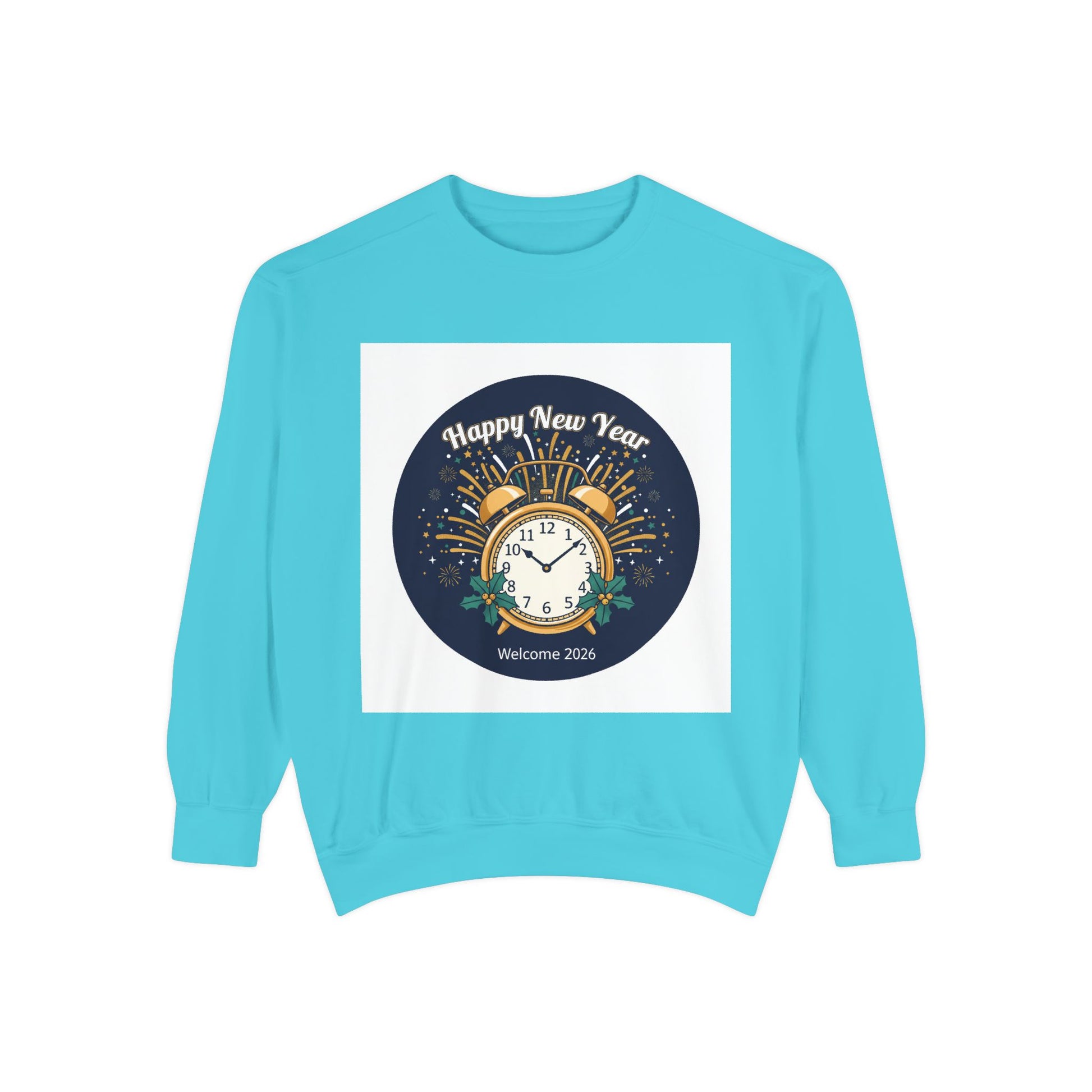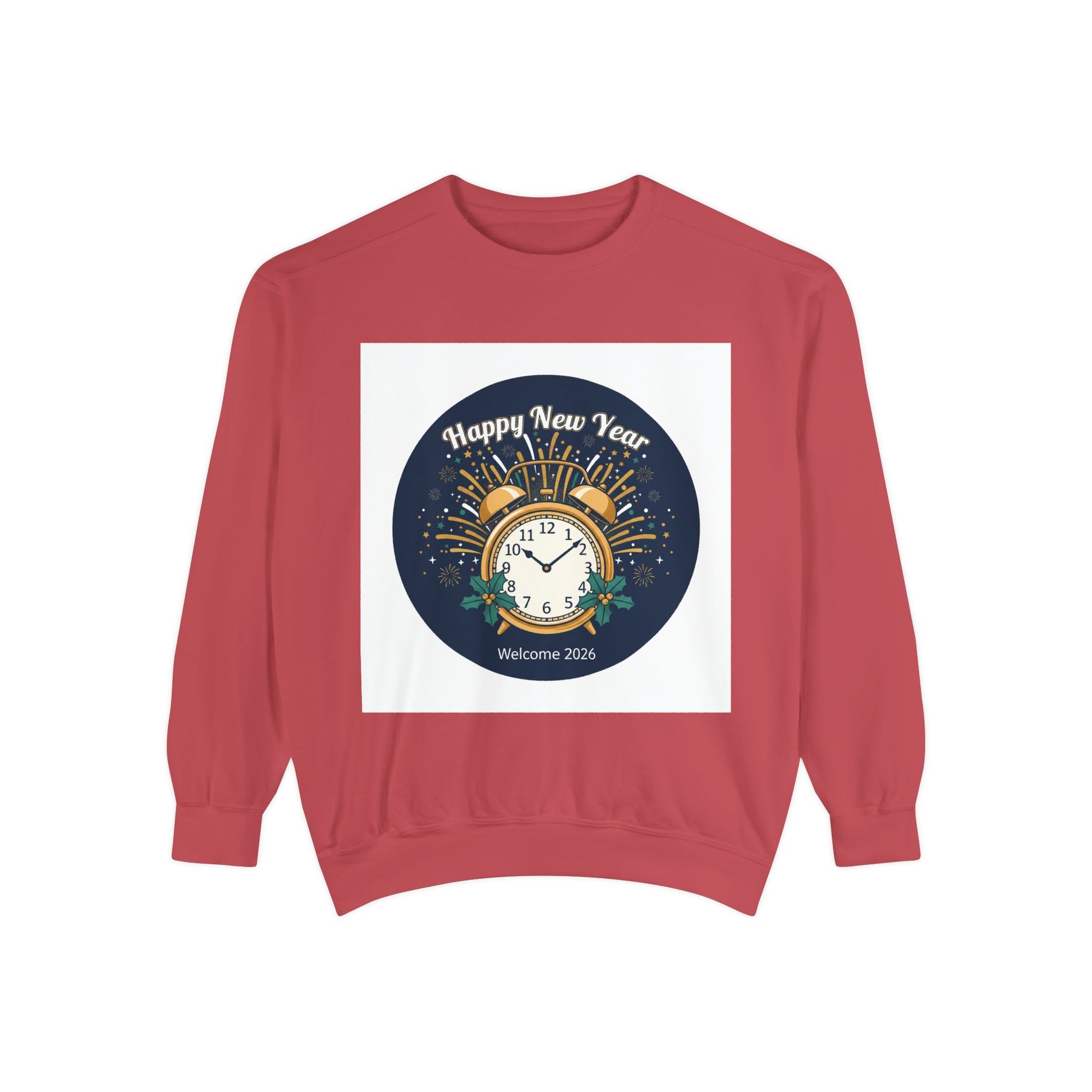 New Year Sweatshirt — "Happy New Year" Clock & Fireworks Graphic