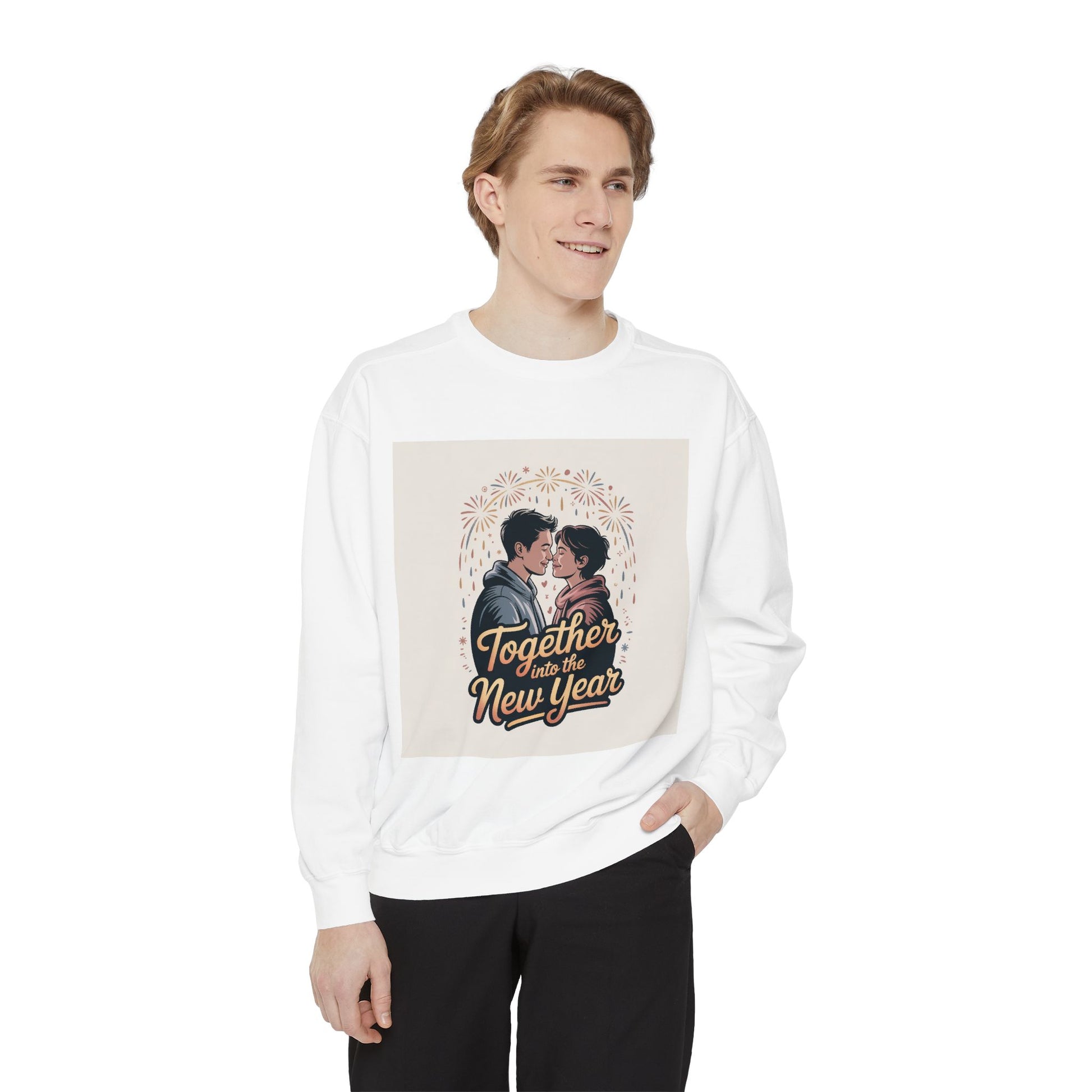 Soft, roomy, and quietly festive, this garment-dyed sweatshirt captures an intimate New Year’s moment. A cozy couple faces each other beneath subtle fireworks and retro typography reading “Together Into the New Year,” evoking late-night walks, warm lights, and the calm right before midnight.